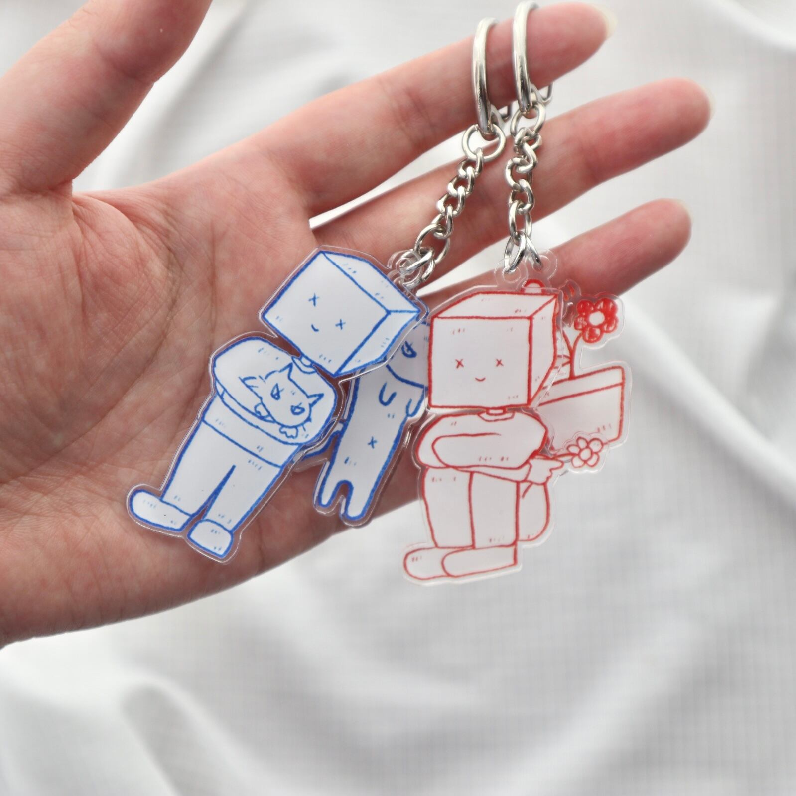 青と赤色の2種類のアクリルキーホルダー。